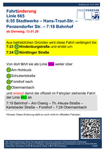 Aus betrieblichen Gründen wird diese Fahrt verlängert bis 7:23 Hindenburgstraße und endet um 7:24 Nördlinger Straße Von dort fährt sie als Linie 664 weiter über Am Hohbuck Schubertstraße Forsthof nach Obermainbach und ersetzt damit die offiziell im Fahrplan stehende Fahrt der Linie 662 ab 7:19 Bahnhof – Am Osang – Th.-Heuss-Straße – Karlsbader Straße – Forsthof – 7:28 Obermainbach Hinweis: Diese Änderung steht so noch nicht im offiziellen Fahrplan