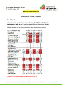 Linie 568: Sonderfahrplan aufgrund der Sperrung ST2660 auf Höhe Bahnbrücke Aufgrund von Helikopterüberflügen wird am Samstag, 28.03.2026, von 07.00 Uhr bis voraussichtlich 18.00 Uhr! die ST2660 auf Höhe der Bahnbrücke vollständig gesperrt. Der Sonderfahrplan ist auf der VGN-Homepage sowie über die VGN-Fahrplanauskunft abrufbar.