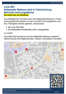 Aus betrieblichen Gründen kann die Haltestelle Rathaus in Fahrtrichtung Bahnhof derzeit von der Linie 663 nicht angefahren wer-den. Fahrgäste werden gebeten, ersatzweise - die Linie 664 oder - die Haltestelle Schillerplatz oder Ludwigstraße zu nutzen. Vom Bahnhof kommend wird die Haltestelle Rathaus weiterhin bedient (außer bei Regionalmarkt, Citylauf, Schwabach trempelt).