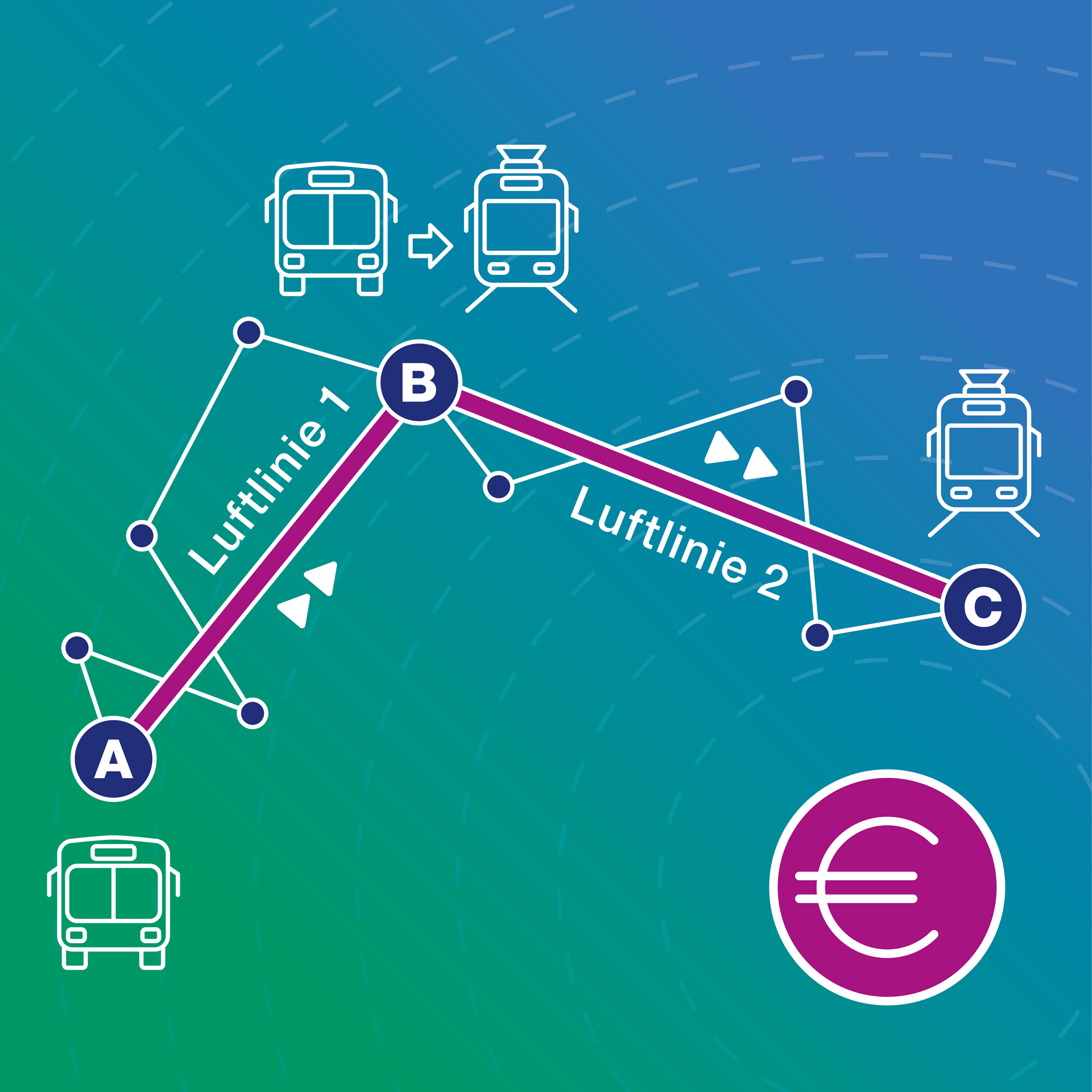 - Bei Direktfahrten ohne Umstieg (Linienfahrt) wird die Luftlinie zwischen Start- und Zielhaltestelle gebildet.