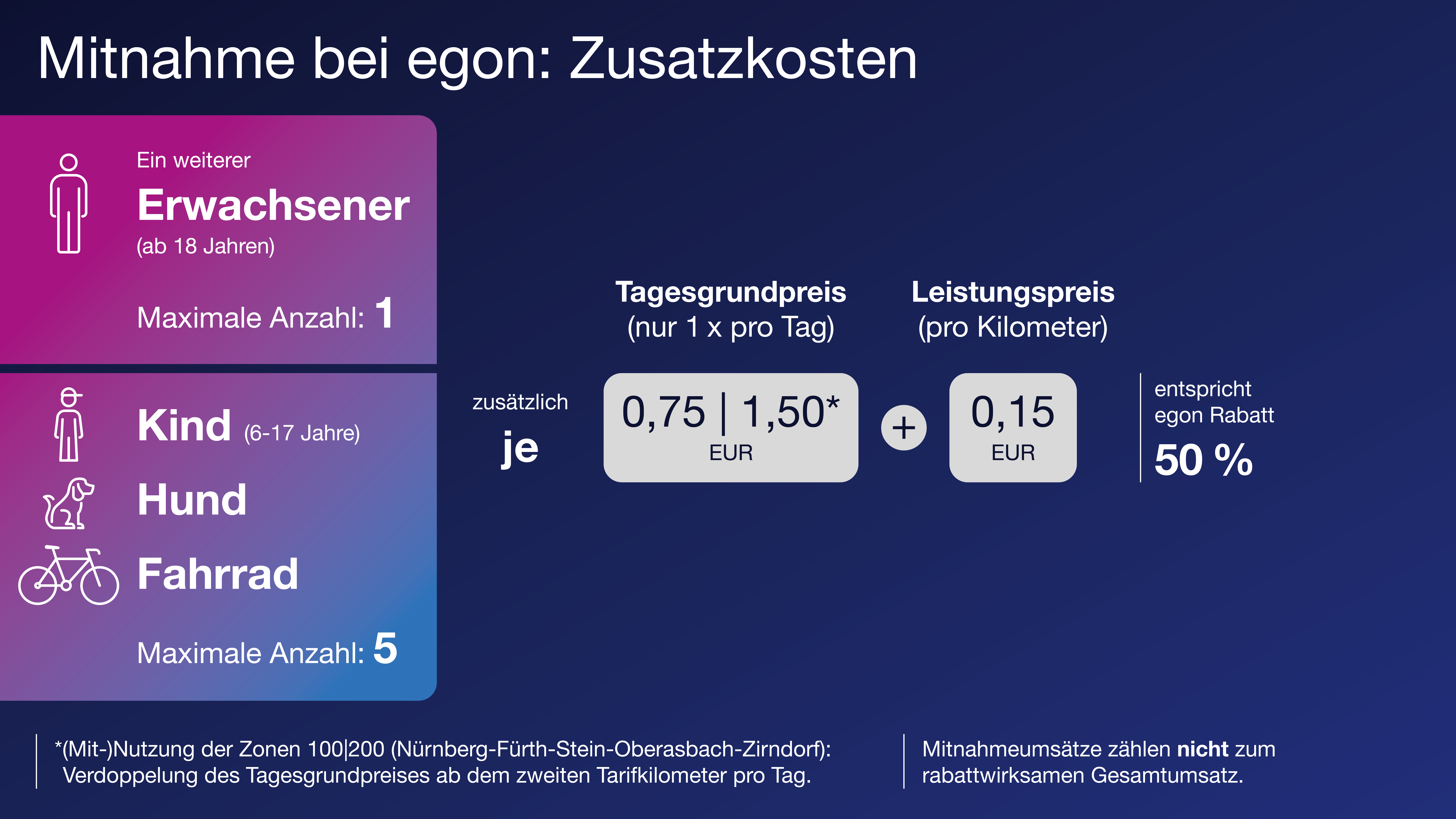 Je Mitnahme – egal ob Erwachsener, Kind, Hund oder Fahrrad zahlst du immer die bekannten Preise der Rabattstufe 50 %. Dabei spielt es keine Rolle in welcher Rabattstufe du dich gerade selbst als registrierter Hauptnutzer befindest.