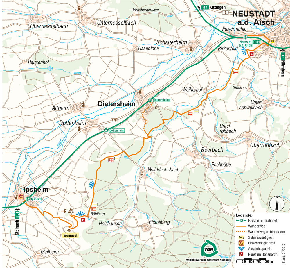 Our hike starts at the train staion in Neustadt an der Aisch R1. Turn right and walk downwards to the railway underpass. Cross the underpass and turn left. Follow