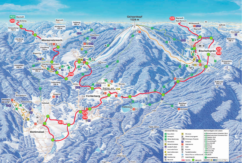 to Fichtelberg. At Fichtelberg follow the "Schneebergstraße". Turn right at "Jahnstraße". Pass the church. At the crossroads turn left to the bus stop "Busbahnhof". Line 369takes you back to Weidenberg R32.