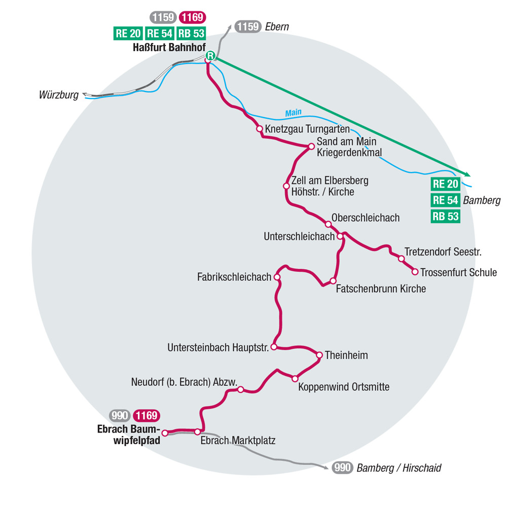 Der Bier- und Wein-Express 1169 fährt von Haßfurt über Sand a. M., Tretzendorf, Untersteinbach nach Ebrach und zurück.