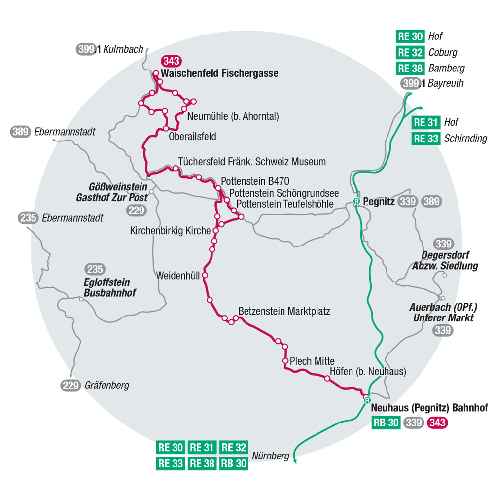 über Plech, Betzenstein, Pottenstein – mit Anschluss an den Wiesenttal-Express 389 – und das Ailsbachtal bis Waischenfeld mitten hinein ins Herz der Fränkischen Schweiz.