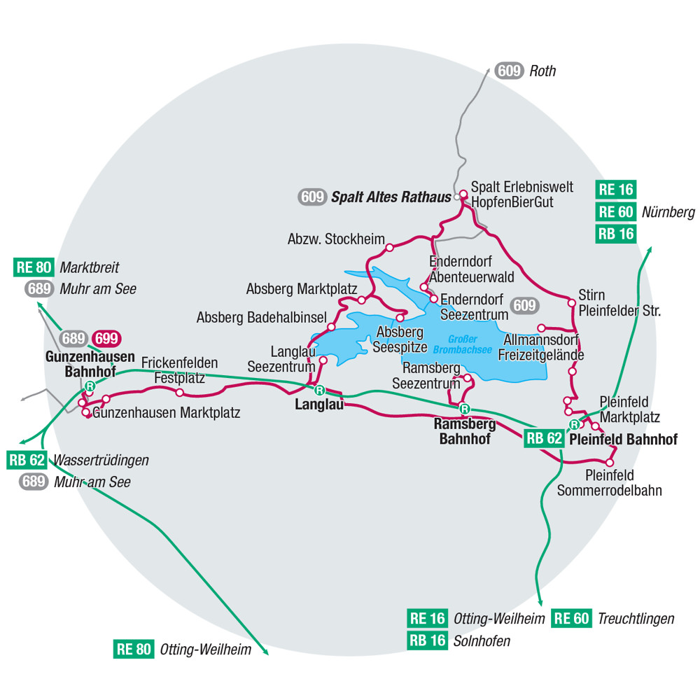 Der Kleine-Brombachsee-Express 699 umrundet den Brombachsee. Er fährt von Gunzenhausen über Langlau und Enderndorf am See nach Spalt und via Allmannsdorf