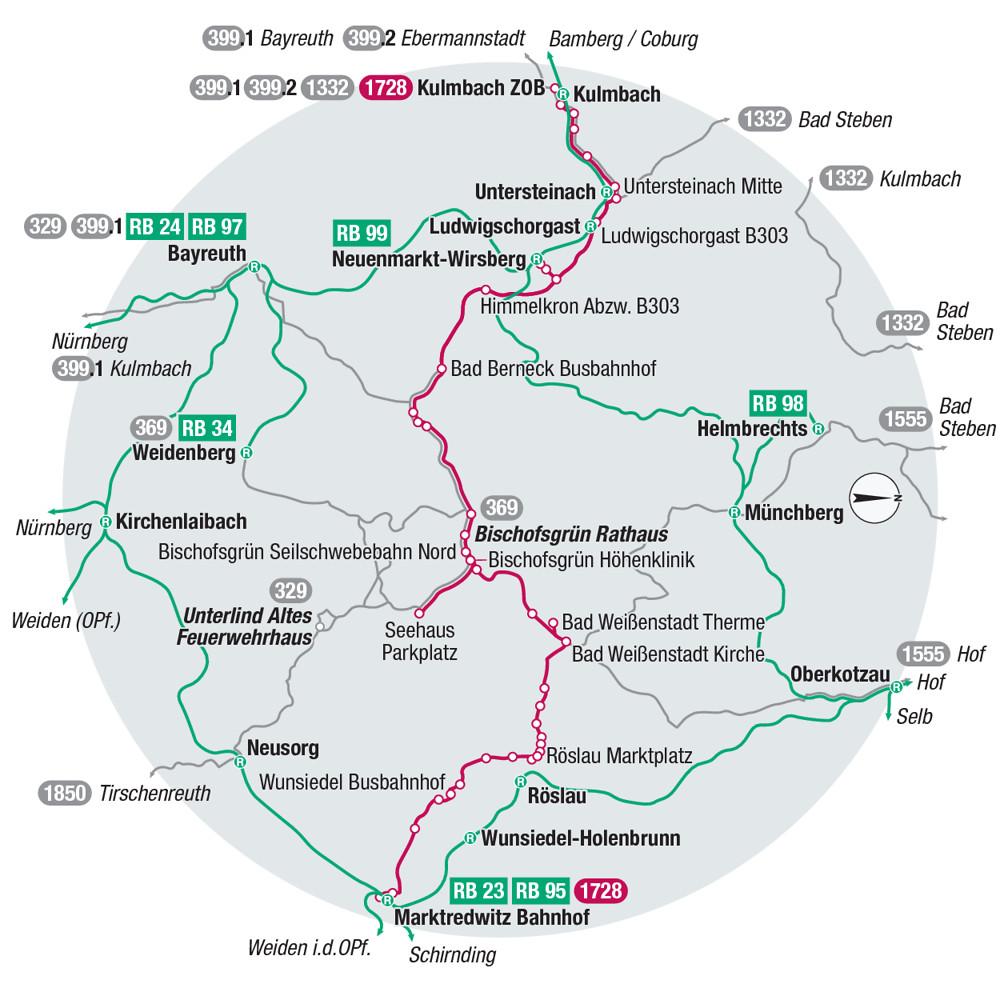 Der Main-Eger-Express 1728 mit Fahrradmitnahme-Option fährt von Marktredwitz über Wunsiedel, Bad Weißenstadt am See, Bischofsgrün und Bad Berneck nach Kulmbach und zurück.