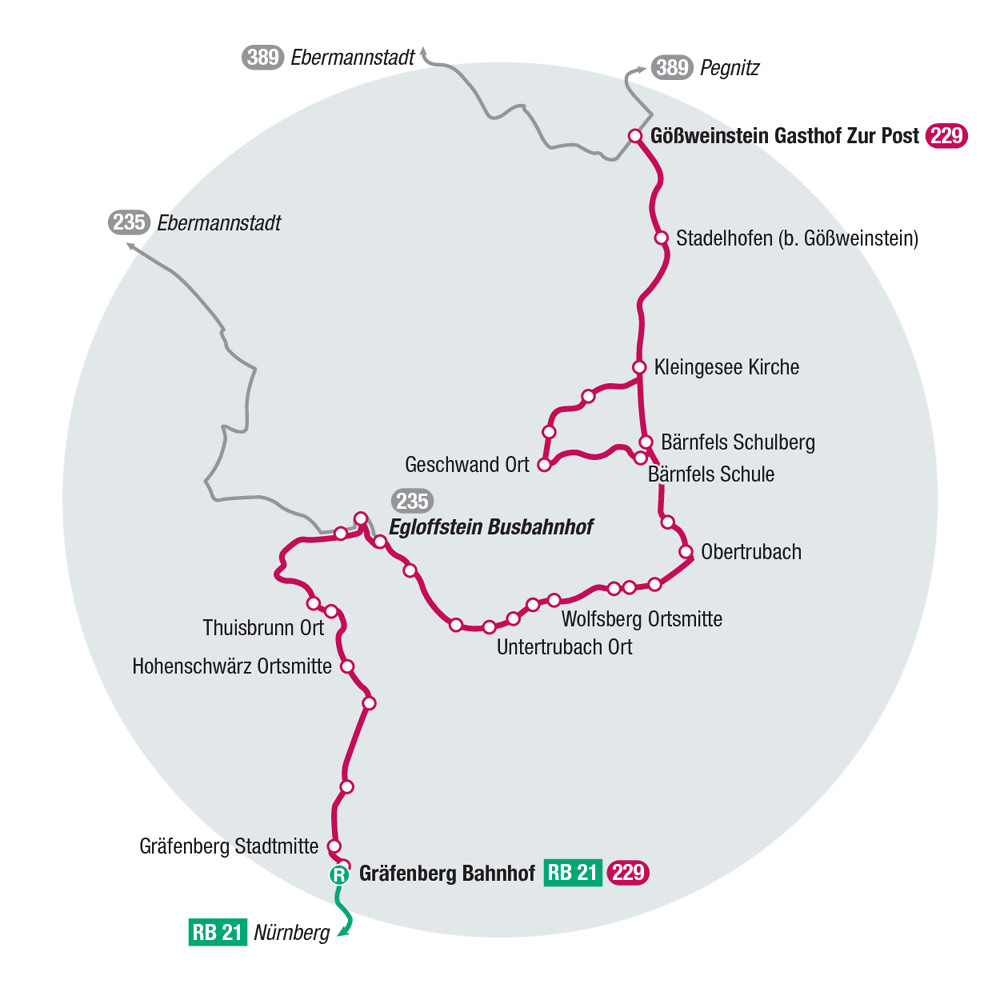 über Thuisbrunn, Egloffstein 235 und Obertrubach nach Gößweinstein, wo ein Anschluss an den Wiesenttal-Express 389 besteht. Neben den pittoresken Felsformationen, Burgruinen und Mühlen im Trubachtal und der Basilika in Gößweinstein bedient der Trubachtal-Express auch die Haltestellen entlang des Fünf-Seidla-Steigs.