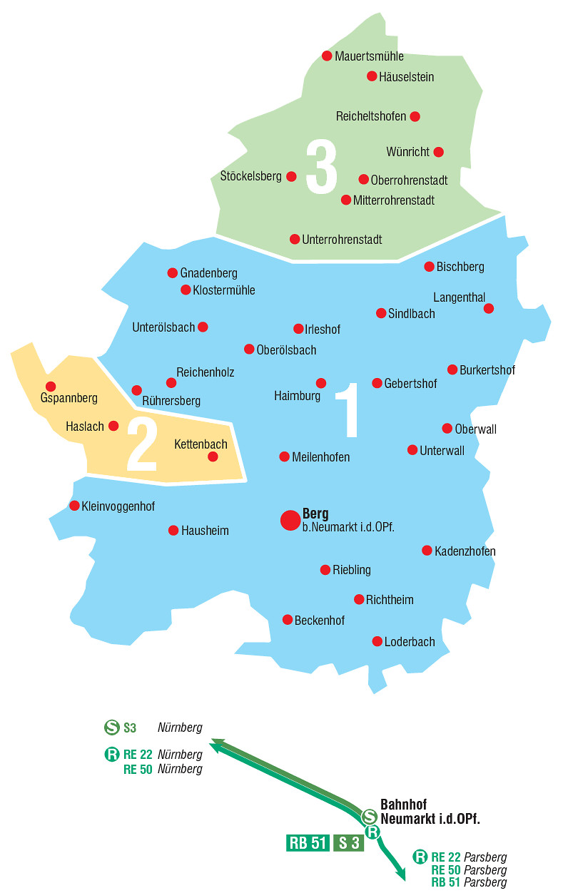 Das Anrufsammeltaxi (AST) ermöglicht die Beförderung zum und vom Bahnhof Neumarkt i.d.OPf. bzw. den Haltestellen Marktplatz und Neuer Markt in das Gemeindegebiet Berg. Das AST holt Sie von einer vereinbarten Haltestelle ab und fährt Sie zum Bahnhof Neumarkt bzw. den Haltestellen Marktplatz und Neuer Markt – oder es holt Sie von dort ab und fährt Sie am Zielort bis vor die Haustür.