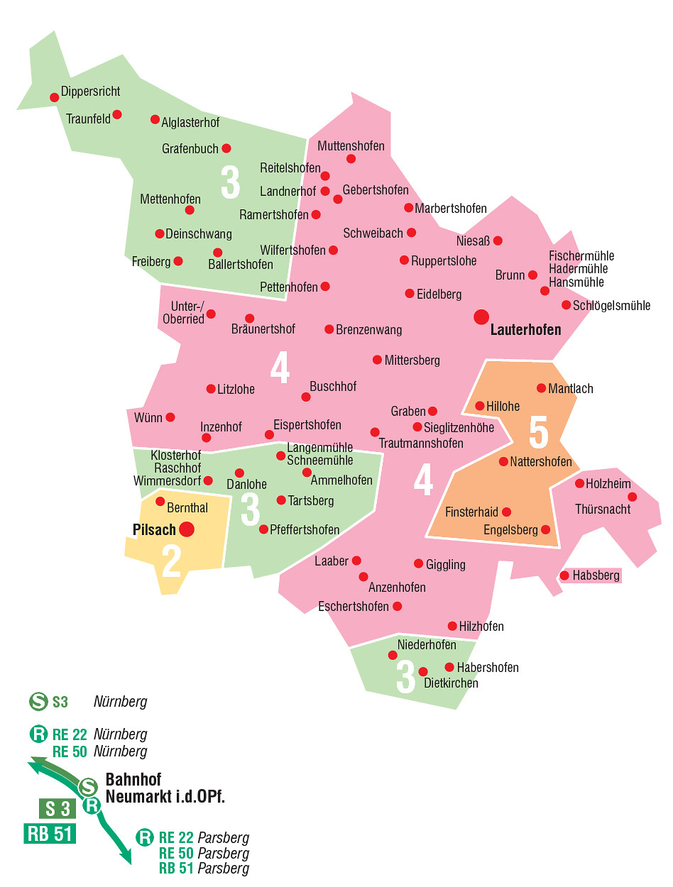 Bitte beachten Sie, dass Fahrten nur in den Gemeindegebieten Lauterhofen und Pilsach bzw. nur innerhalb von Neumarkt nicht möglich sind.