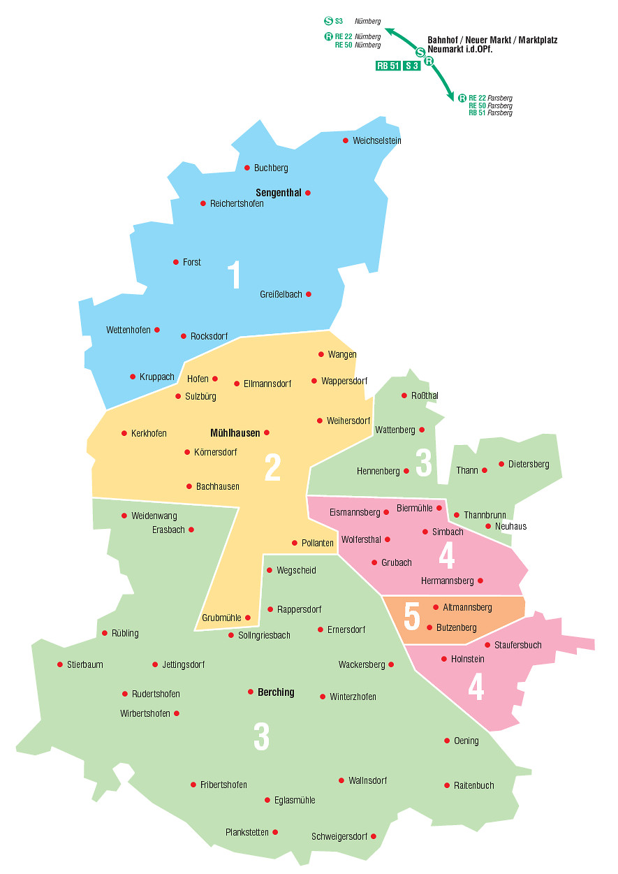 Bitte beachten Sie, dass Fahrten nur in den Gemeindegebieten Sengenthal, Mühlhausen und Berching bzw. nur innerhalb von Neumarkt nicht möglich sind.