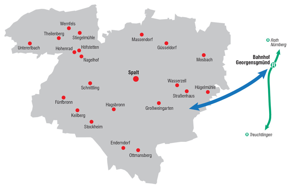 Das Anrufsammeltaxi (AST) holt Sie vom Bahnhof Georgensgmünd ab und fährt Sie zu Ihrem Ziel im Stadtgebiet Spalt bis vor die Haustür. In Gegenrichtung, zur Fahrt zum Bahnhof Georgensgmünd, ist die Abholung an allen Haltestellen im Stadtgebiet Spalt möglich.