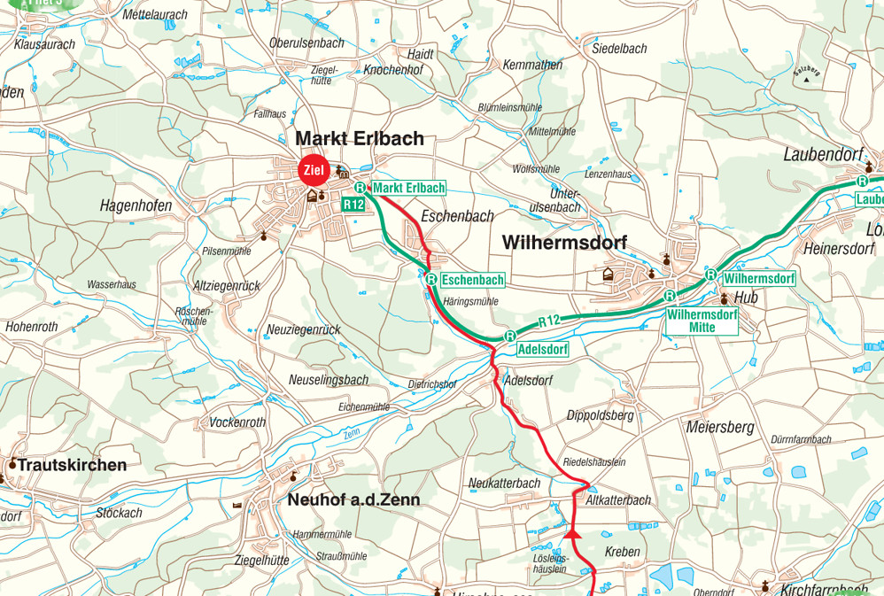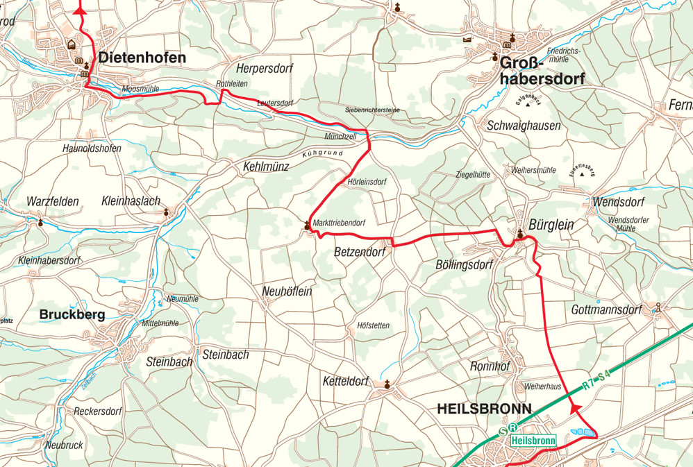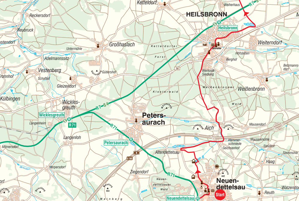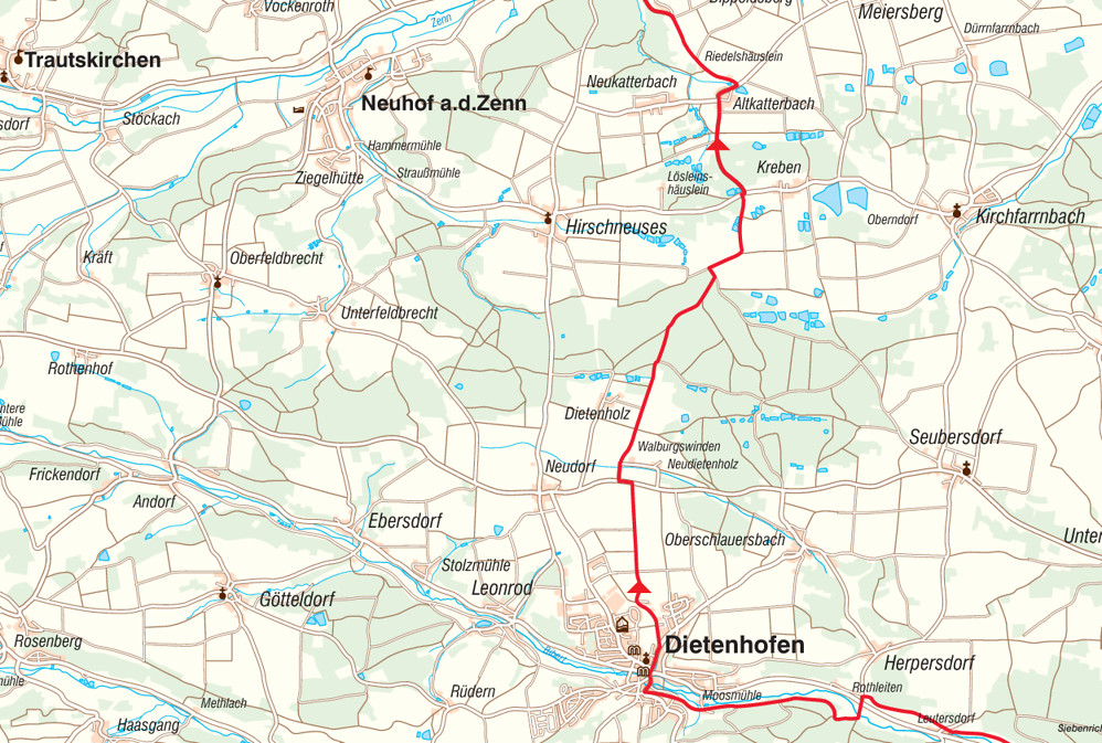 Neuendettelsau – Aich – Heilsbronn – Bürglein – Betzendorf – Markttriebendorf – Biberttal – Dietenhofen – Altkatterbach – Adelsdorf – Eschenbach – Markt Erlbach
