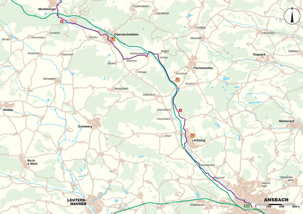 , die wir bis Oberdachstetten mehrfach queren. Da auch die Bundesstraße auf der anderen Seite der Rezat verläuft, sind auf den von uns genutzten Ortsverbindungsstraßen bis Lehrberg kaum Autos unterwegs. Vor Lehrberg verläuft der Radweg ein Stück neben der Bahnlinie. Wir unterqueren hier die Bundesstraße 13 und fahren dann über eine Allee direkt auf den Ortseingang zu. Nach der Rezatbrücke gleich wieder links weg und weiter am Fluss entlang bis zur Einmündung in die Hauptstraße (St 2250). Hier aufgepasst! Unser Radweg führt weg vom Fluss. Nach Überquerung der Straße fahren wir über die Ballstadter Straße aus dem Ort hinaus. Am Seebach geht es auf einem Wirtschaftsweg nach links und dann in weitem Bogen an einem Waldstück entlang wieder in Richtung Bahnstrecke und Flusslauf. Die Rezat verläuft in ihrem oberen Teil für uns weitgehend „unsichtbar“ auf der anderen Seite der Bahnstrecke. Ab dem Ortseingang von Kellern befahren wir wieder Nebenstraßen. Über Dörflein und Berglein erreichen wir Mitteldachstetten. Hier überqueren wir ein letztes Mal die Bahnstrecke und danach die Rezat (hier nahe der Quelle eher ein Bächlein). Über Möckenau kommen wir zur B 13 und nach einem langgezogenen leichten Anstieg zu unserem Zwischenziel Oberdachstetten RB 80.