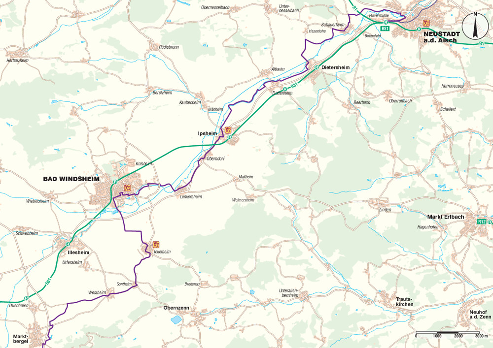 Der Gegenwert: Wir befahren zwei sehr reizvolle Flusstäler, die Frankens Landschaft prägen. Dazwischen liegt mit der Frankenhöhe eine Hochebene, die uns sehr schöne Aussichtspunkte bietet. In diesem Gebiet (und nicht weit voneinander entfernt) entspringen auch die beiden Flüsse, deren Lauf wir folgen: Im ersten Teil die Fränkische Rezat; im letzten Abschnitt die Aisch. Wer die Strecke abkürzen oder teilen möchte, der findet mit Oberdachstetten RB 80 und Bad Windsheim RB 81 passende Zwischenziele mit VGN-Anschlussmöglichkeiten. Auf geht’s!