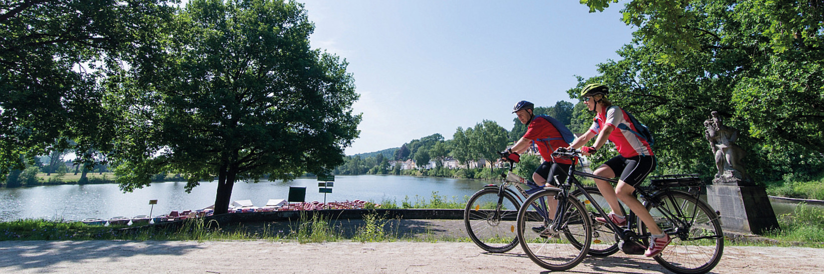 Es geht über Priesendorf in Oberfranken nach Trabelsdorf an Weihern und einem Badesee vorbei, rechter Hand die markante Silhouette der Burganlage Lisberg und über ein ausgedehntes Weidegebiet in den Flussauen: Weideland der Heckenrinder.