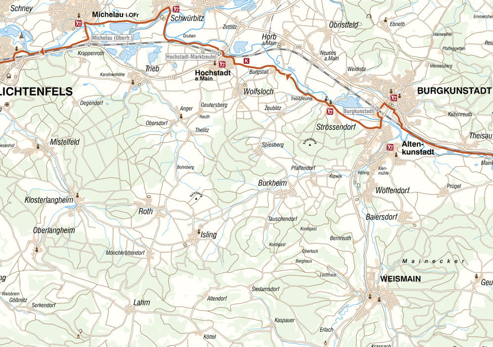 Dort links vorbei, dann rechts abbiegen. Nach einer Weile hinab zur Trebitzmühle. Da rechts Richtung Burgstall. Wald und auf Schotter am Main entlang. Abwärts nach Burgstall. In der Ortschaft etwas aufwärts und geradeaus. Hinweis auf Hochstadt und Lichtenfels.