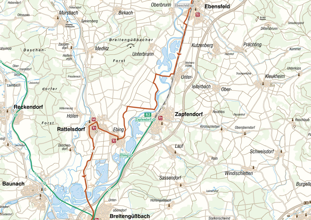 Nach Ebing auf der Straße Richtung Rattelsdorf. Etwa 2 km geradeaus, dann links. Ebing. Beim Hinweis Gasthaus zum grünen Baum rechts aufwärts. Über die Kirchstraße, am Marktplatz rechts. Hinweis Rattelsdorf/Bamberg. Nach der Schule ein separater Radweg.