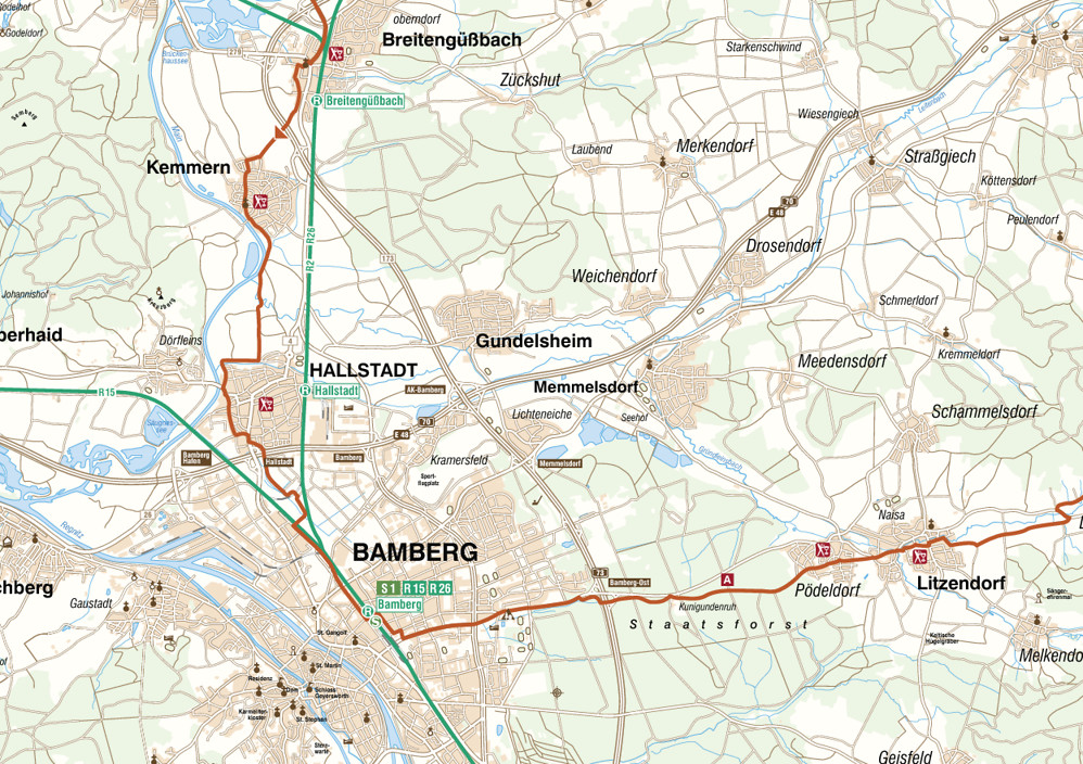 Weiter am Marktplatz links, durchs Torhaus, die Bamberger Straße entlang. Am Ortsende mit abknickender Vorfahrt rechts. Radweg Bamberg neben der B 4. In der Ferne schon der Turm der Bamberger Altenburg.