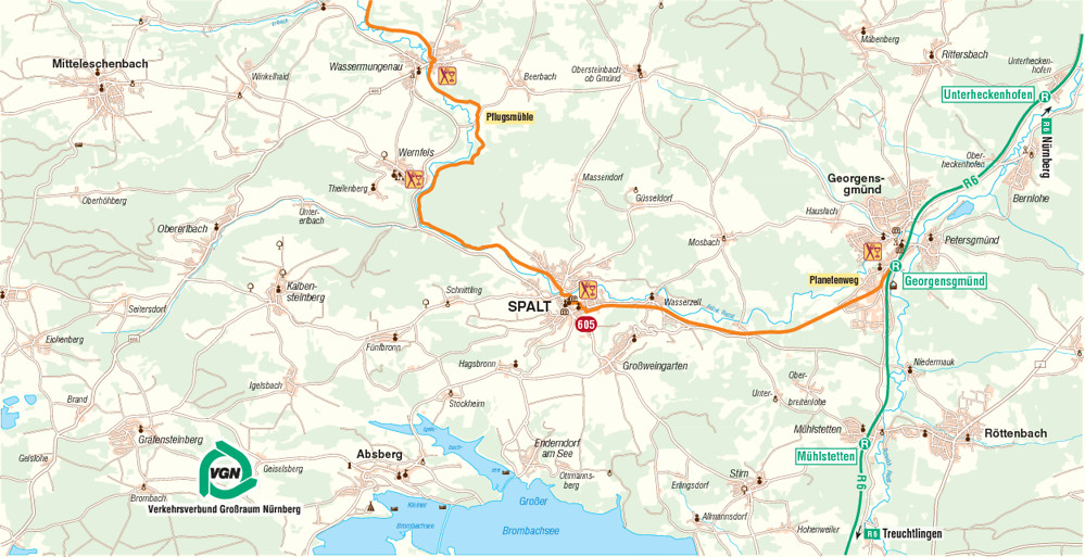 Der Bahnhof von Spalt wurde umfassend renoviert (jetzt Kulturzentrum) und einige Reste des alten Gleisbetts sind als nostalgische Elemente noch erhalten geblieben. Auf dem asphaltierten Weg geht es komfortabel und ohne große Höhenunterschiede weiter mit eindeutiger Markierung in Richtung Osten bis nach Georgensgmünd. Die Informationstafeln des Georgensgmünder Planetenwegs begleiten unseren Weg.