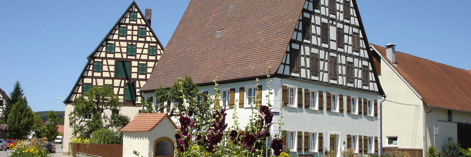 Aus dem Bächlein ist inzwischen ein richtiger Fluss geworden! Wir folgen dem Lauf der Rezat in Richtung Ortsmitte – in diesem Abschnitt offensichtlich ein Entenparadies. Während die Enten sich rechts von uns gelassen am und im Fluss tummeln, fällt uns auf der linken Seite ein sehr individuell gestaltetes Anwesen auf. Lehrberg scheint ein geeigneter Ort für Individualisten und Sammler zu sein! Am Ende der Rezatstraße geht es nach rechts über eine Brücke ein kurzes Stück durch eine Allee. An deren Ende weist der Weg uns nach links nach Ansbach und wir folgen nun auch der Radwegmarkierung „Burgenstraße“, die uns auf dem nächsten Abschnitt über Ansbach hinaus bis nach Lichtenau leitet.