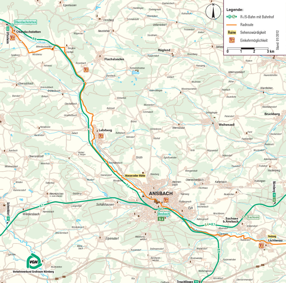 Wem die Gesamtstrecke zu lang ist, hat in Ansbach einen hervorragenden Start- und Zielpunkt, um die Strecke in zwei Etappen „aufzuteilen“ (VGN-Anschluss: S4/
