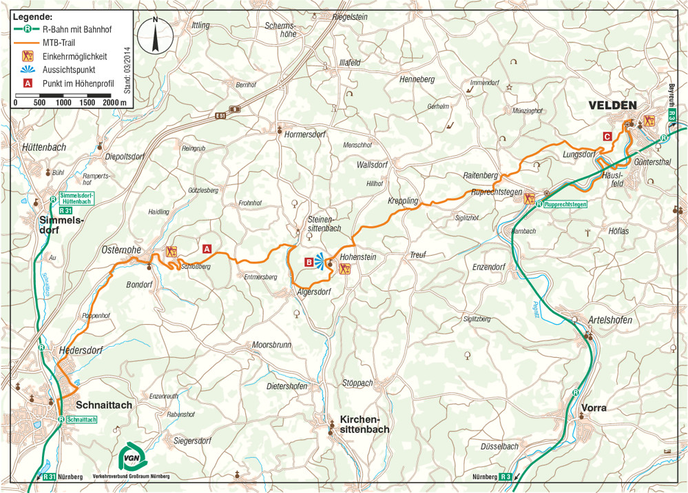 Der ultimative Feierabend-Kick von Schnaittach RB 31 nach Rupprechtstegen RB 30. Wer die Abwechslung sucht, wer´s eher kurz und knackig liebt, der ist bei dieser feinen Biketour am Rande der Fränkischen Schweiz genau richtig.