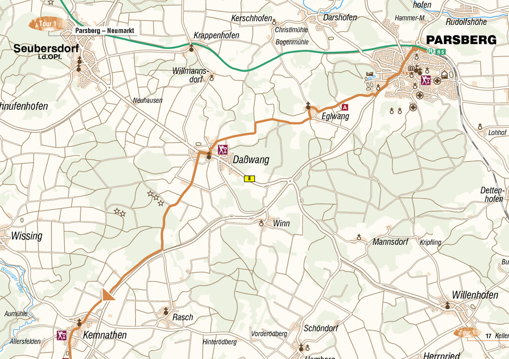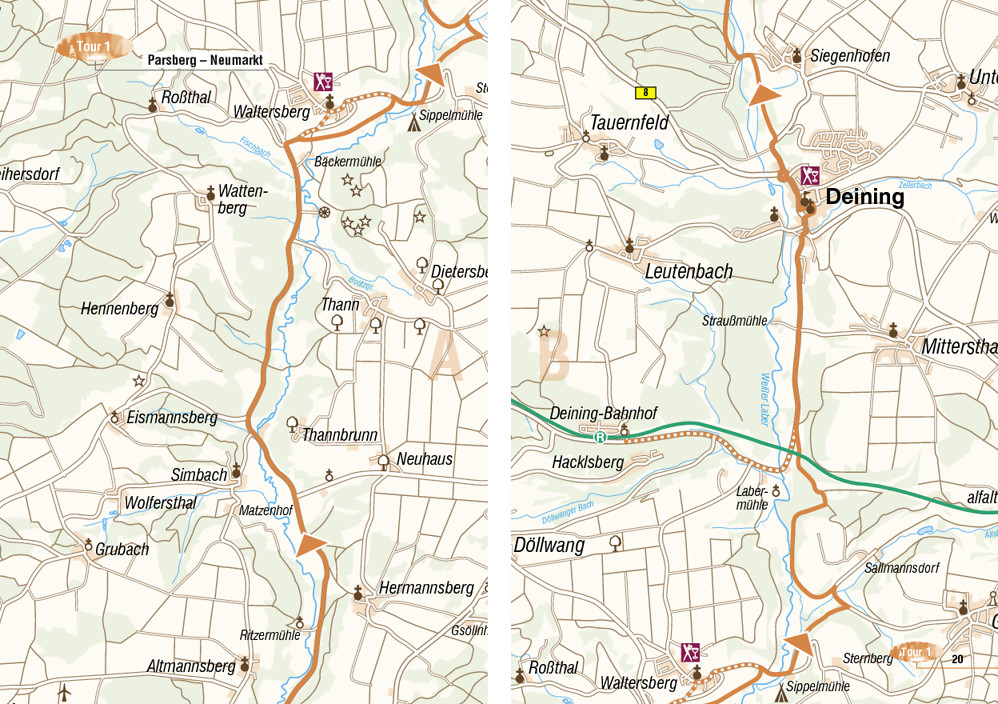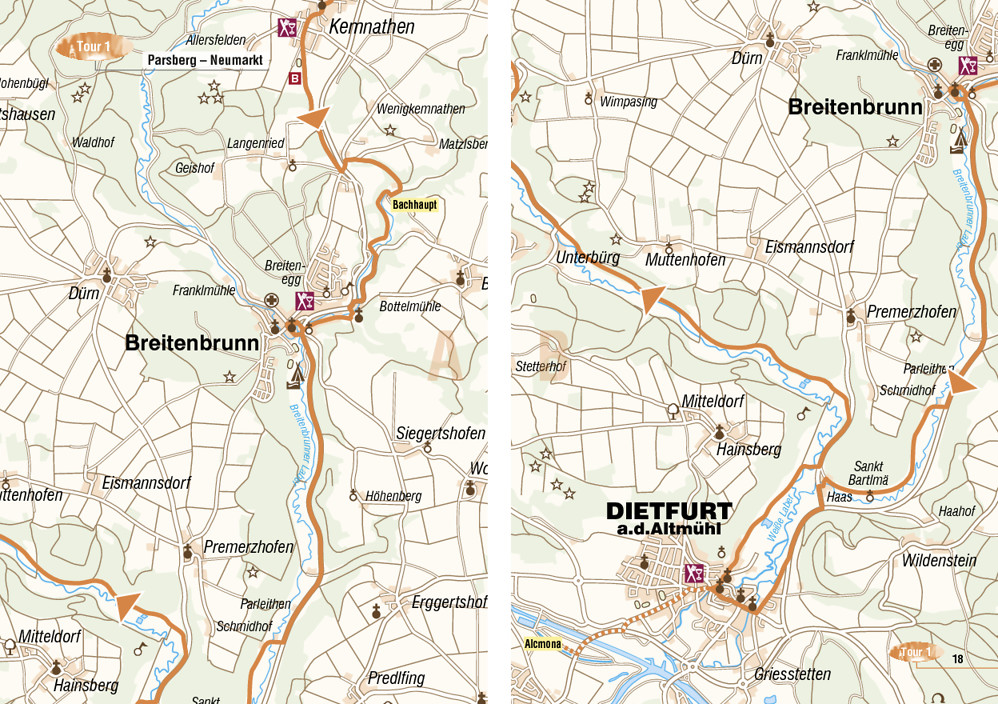 Markierung: Von Parsberg bis Dietfurt mit dem Naab-Altmühl-Radwegzeichen, zwischen Sippelmühle, Deining und Siegenhofer Mühle mit den Wanderzeichen Jurasteig und Wasser-Mühlen-Weg. Doch auch ohne Spezialmarkierung finden wir unseren Weg bis Neumarkt spielend anhand der Straßenschilder, ganz abgesehen von der vorliegenden Beschreibung.