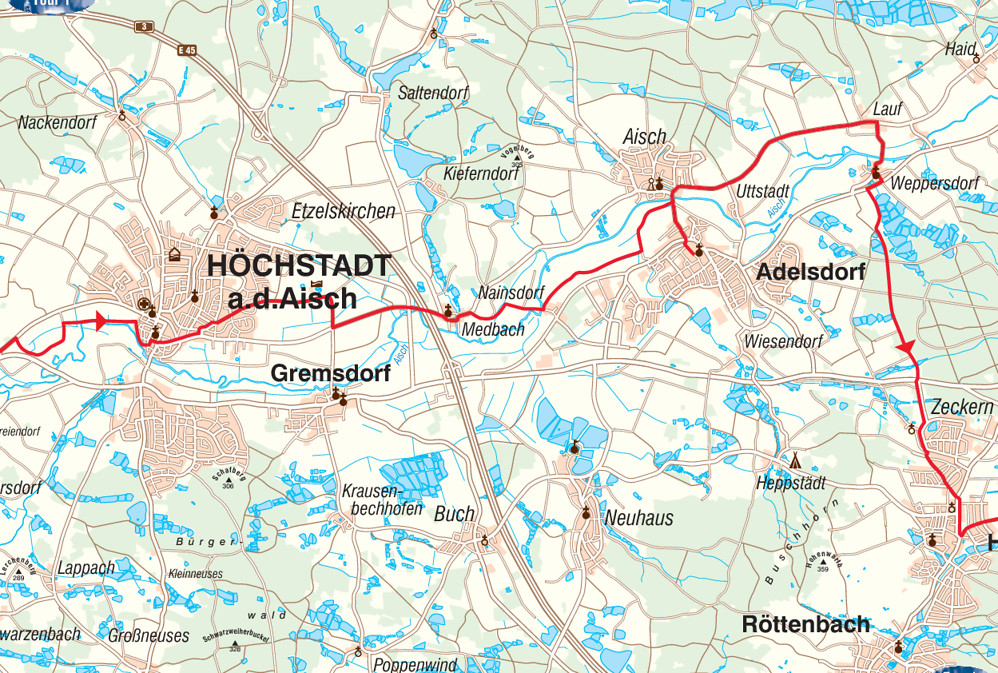 bis Höchstadt. Nun wieder der Aischtalradweg bis Nainsdorf. Von da im Talgrund nach Aisch und später nochmals mit dem Aischtalradweg bis Lauf. Hier übernimmt Radweg