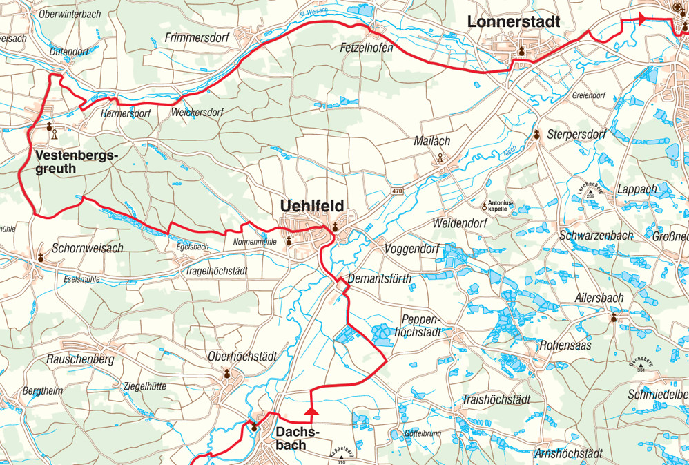 Geradeaus in den Ort, beim Vorfahrtschild rechts, sofort links und beim Abenteuer-Aussichtsturm noch einmal links. Dann rechts zur rotgelb geländerten Aischbrücke nach Uehlfeld. Wir halten uns Richtung Kirche, fahren aber an der Kurve vor der Apotheke geradeaus Richtung Vestenbergsgreuth. Dann geht‘s dreimal links: an der folgenden Gabelung, beim Hinweis zum Rathaus und schließlich vor dem Rathaus (km 22).