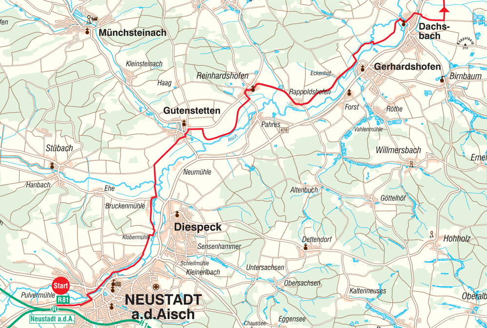 Start ist in Neustadt (Aisch) am Bahnhof RE 10/RB 81/S6.
