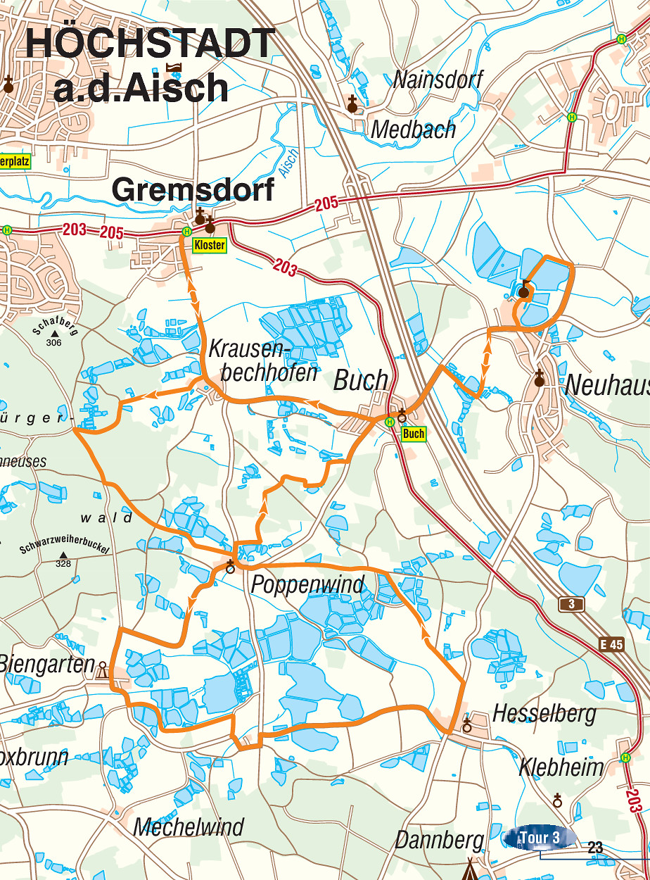 Startpunkt ist entweder Buch oder Gremsdorf. Vom Erlanger Busbahnhof aus erreichen wir „Buch (b. Gremsdorf)“, so der offizielle Name, mit Buslinie 203 und Gremsdorf (Haltestelle Kloster) mit der 205 direkt.Nach Buch besteht werktags praktisch nur eine Verbindung – morgens eine Fahrt hin und nachmittags eine zurück. Nach und von Gremsdorf fahren dagegen – auch am Wochenende – mehrere Busse.