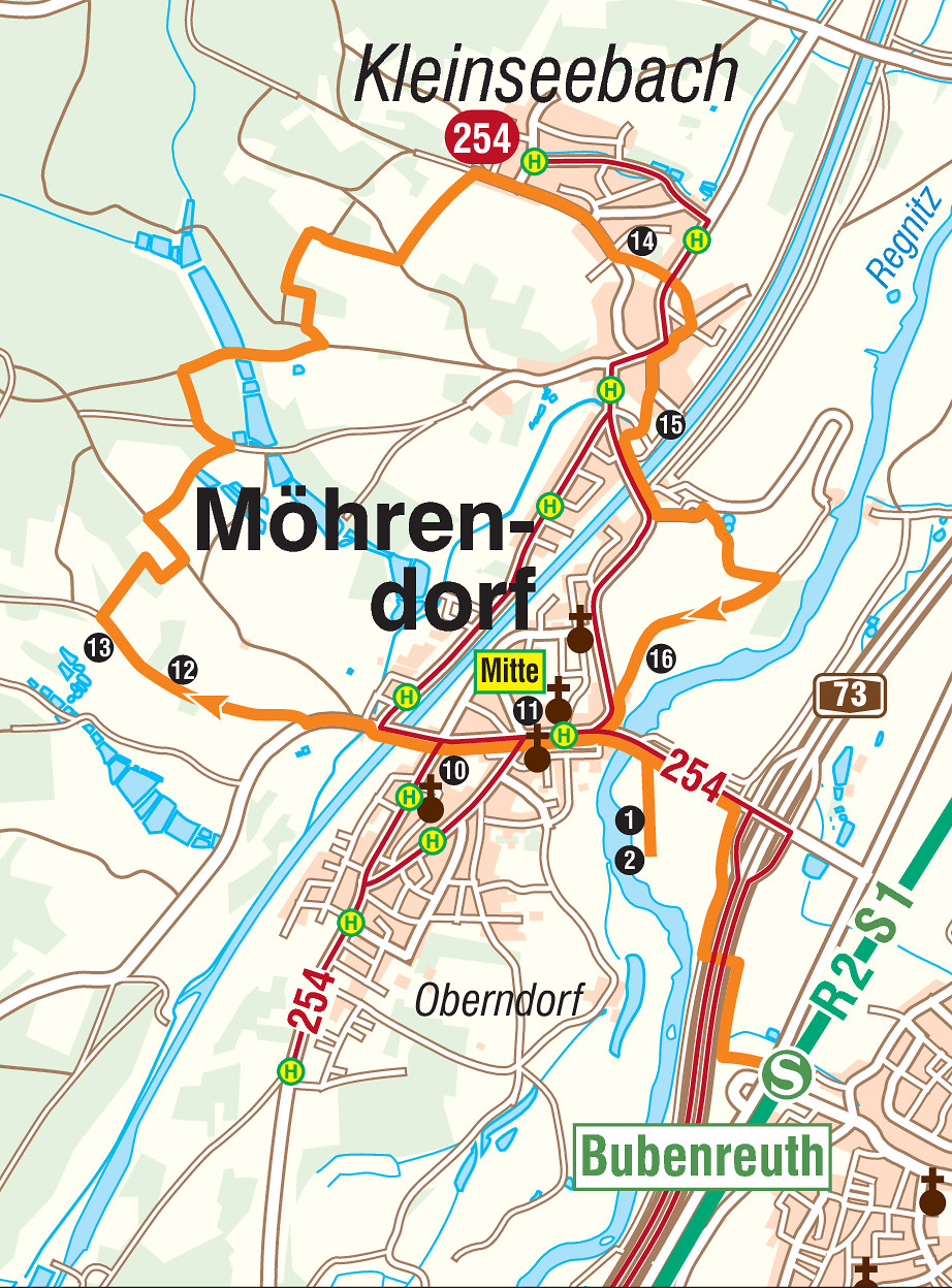 Wasserschöpfräder prägten einst die Landschaft entlang der Regnitz. Heute drehen einige der letzten dieser Dinos bei Möhrendorf ihre Runden. Besichtigen kann man sie und weitere Sehenswürdigkeiten über eine südliche und eine nördliche Schleife, die jeweils etwa 8 km lang sind. Bei der An- und Abreise über Bubenreuth kommen noch zwei mal 2 km hinzu. Wir beginnen mit der südlichen entweder ab Bahnstation Bubenreuth oder ab Bushalt Mitte in Möhrendorf. Die Besichtigungspunkte sind beschildert und durchnummeriert. Das Rundwegzeichen markiert unseren Weg, allerdings nicht überall klar erkennbar. An manchen Stellen also bitte aufpassen. Hinfahrt entweder mit der Buslinie 254 ab Erlangen Bahnhofplatz (Richtung Kleinseebach) bis zur Haltestelle Möhrendorf Mitte oder mit S1 bis Bahnhof Bubenreuth. Rückfahrt von denselben Haltestellen. Bitte beachten: die Buslinie 254 fährt sonn- und feiertags nicht.