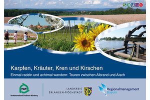 Dann, wieder bei einem Kirschenhäuschen, rechts. Schließlich stoßen wir auf die Straße Kalchreuth – Erlangen. Hier zunächst den Parkstreifen links aufwärts, dann den Fuß-/Radweg noch ca. 150 m weiter nach oben und da rechts zu dem Parkplatz einschwenken. Links geht es zum Sklavensee, aber wir wenden uns am Parkplatzende rechts hinunter.