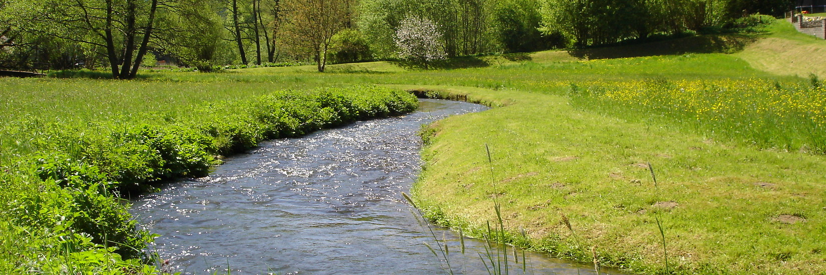 Am Freibad biegst du rechts ab in Richtung Weigendorf. Hier mündet der Reinbach in den Etzelbach. Letzterem folgst du weiter – mit der Markierung Fünf-Flüsse-Radweg.
