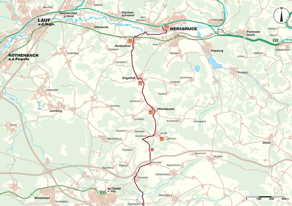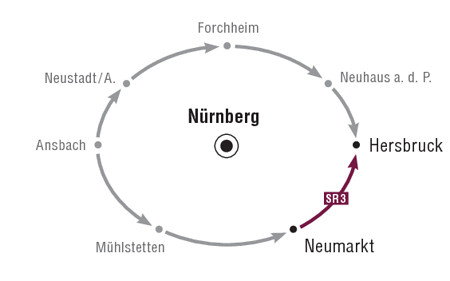 Hinweis: Nördlich des Stadtzentrums befindet sich der Bahnhof „Hersbruck rechts der Pegnitz“. Hier fahren die