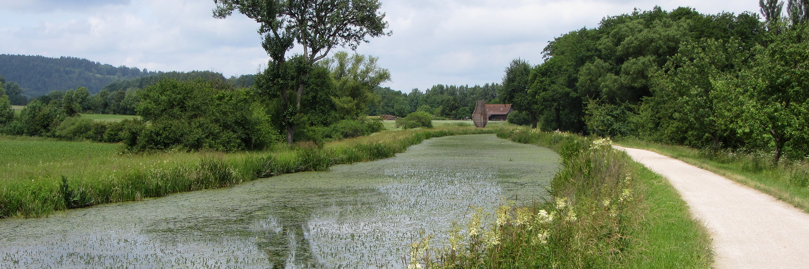 Der Alte Kanal liegt im folgenden Abschnitt erhöht und bietet nach rechts weite Ausblicke. Bei Ober- / Unterölsbach ändert sich die Richtung des Kanals von Süd / Nord nach Westen. Bei diesem weiten Bogen verlassen wir den Alten Kanal und folgen nach rechts unserer neuen Radwegbeschilderung „Laber-Pegnitz-Radweg“, die uns auf dem nächsten Streckenabschnitt leiten wird.