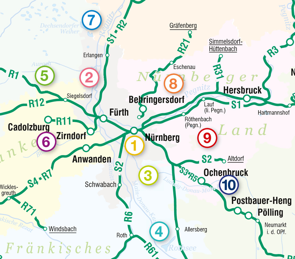 Die Tourenvorschläge sind auf die Kombination einer Radtour mit der Nutzung von VGN-Verkehrsmitteln abgestimmt. Besondere Bedeutung haben dabei die S-Bahnen und die RB-Verbindungen im VGN-Gebiet. In diesen Fahrzeugen gibt es am meisten Platz für die Mitnahme von Fahrrädern. Bitte beachten Sie im Einzelfall die besonderen Hinweise bei den Streckenbeschreibungen.