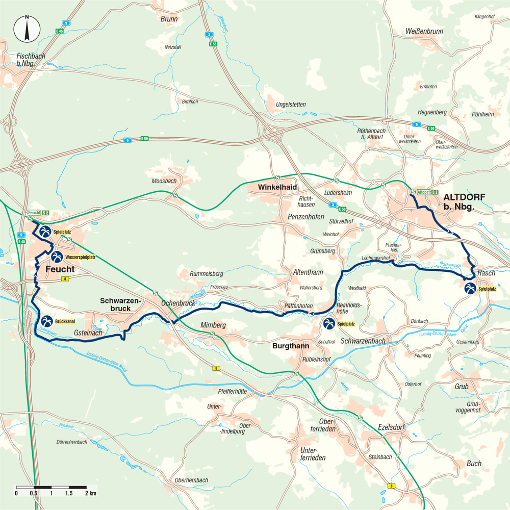 Wir fahren auf der Zufahrtstraße (Am Brückkanal) in Richtung Feucht. An der Einmündung zur Schwarzenbrucker Straße kurz nach rechts, dann gleich wieder links auf den beschilderten Radweg in ein Wäldchen einbiegen. Wir kommen zur Gsteinacher Straße, der wir weiter durch ein Industriegebiet folgen.