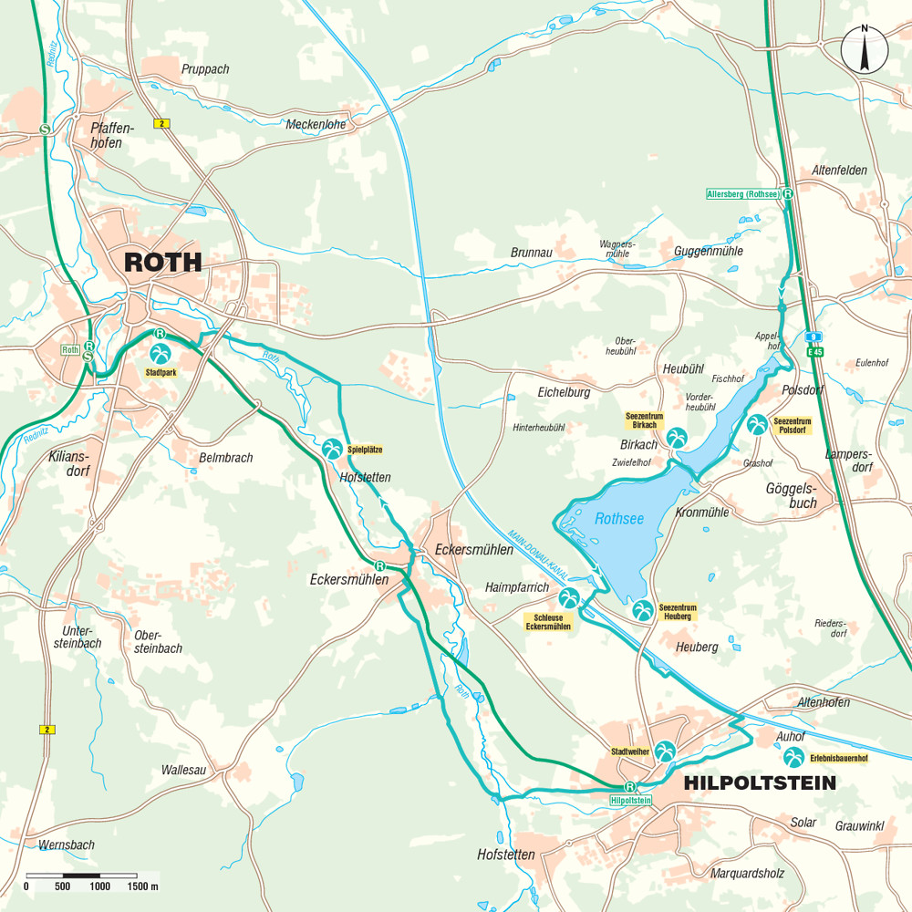 In Eckersmühlen biegen wir vom Wallersbacher Weg alsbald nach rechts ab (Am Föhrenbaum) und fahren weiter bis zur Wernsbacher Straße. Hier nach rechts über den Bahnübergang und weiter vorsichtig entlang der Hauptstraße ( ohne Radweg) bis zur Gaststätte „Posthorn“. Glücklicherweise können wir nun die nach rechts abknickende Vorfahrtstraße verlassen und geradeaus in die Ringstraße fahren. Kurz danach auf einem unscheinbaren Pfad nach rechts über einen Steg, der die Roth überquert. Danach nach links und mit Radwegweisung immer weiter in Richtung Roth. Auf diesem Weg über Hofstetten an einer Deponie vorbei, kontinuierlich weiter durch ein Wasserschutzgebiet. Schließlich stoßen wir wieder auf eine asphaltierte Straße (Rothgrund) und folgen dieser nach links. Weiter in Fahrtrichtung unterqueren wir die Bundesstraße 2 (davor: das Feuersteinwehr an der Roth). An der ersten Abzweigung nach der Unterführung (Am Espan) fahren wir nach links und bis zur Hilpoltsteiner Straße.
