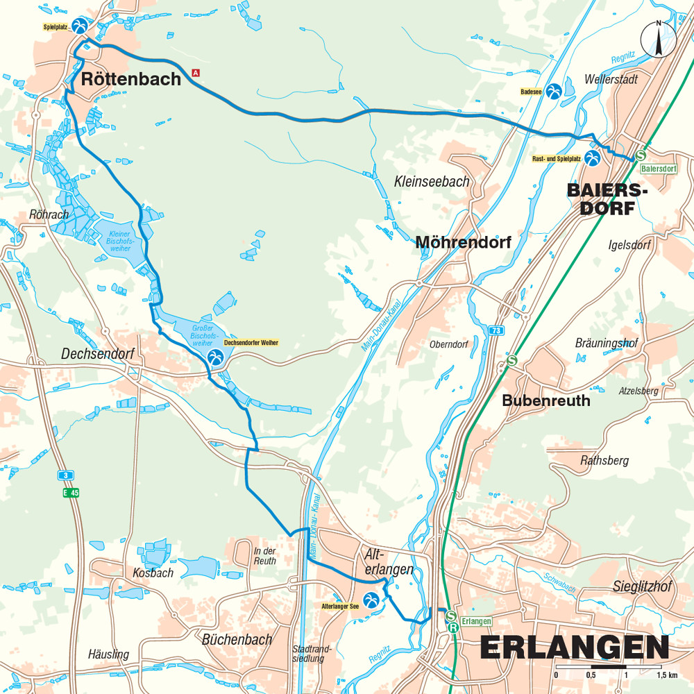 Von hier auf schattigen Waldwegen bis zum Dechsendorfer Weiher, danach weiter an etlichen weiteren Weihern vorbei bis nach Röttenbach. Im Ort leider ohne Radwege.