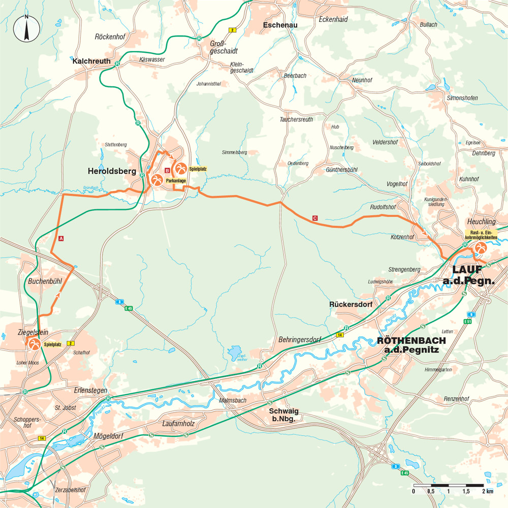 Wie der Untertitel schon vermuten lässt, fahren wir bei dieser Tour überwiegend durch Waldstücke. Sie ist also auch sehr gut für heiße Tage geeignet, an denen man gern im Schatten unterwegs ist. Langweilig wird es dabei trotzdem nicht, da zwischendurch mit Heroldsberg ein Ort am Weg liegt, in dem es viel zu sehen und zu erleben gibt. Und auch die Stadt Lauf bietet eine Menge an Sehenswertem und schöne Rastplätze, um sich vor der Heimfahrt noch einmal zu erholen und aufzutanken. Zwischen Buchenbühl und Heroldsberg und von Heroldsberg bis zur Abzweigung nach Günthersbühl fahren wir auf einer schmalen Verbindungsstraße durch den Wald, die auch für Kraftfahrzeuge erlaubt ist. Hier sind aber meist nur wenige Autos unterwegs. In Lauf wird es bei der Fahrt bis zum Marktplatz entlang der Nürnberger Straße teilweise recht eng, da sich Fußgänger und Radfahrer den gemeinsamen Gehweg teilen müssen, was besondere Vorsicht erfordert. Auch auf dem letzten Stück bis zum Bahnhof Lauf (links der Pegnitz) gibt es stellenweise viel Kraftfahrzeugverkehr. Für die Ortsdurchfahrten und die Teilstücke ohne Radwege sollte eine ausreichende Fahrsicherheit vorhanden sein.