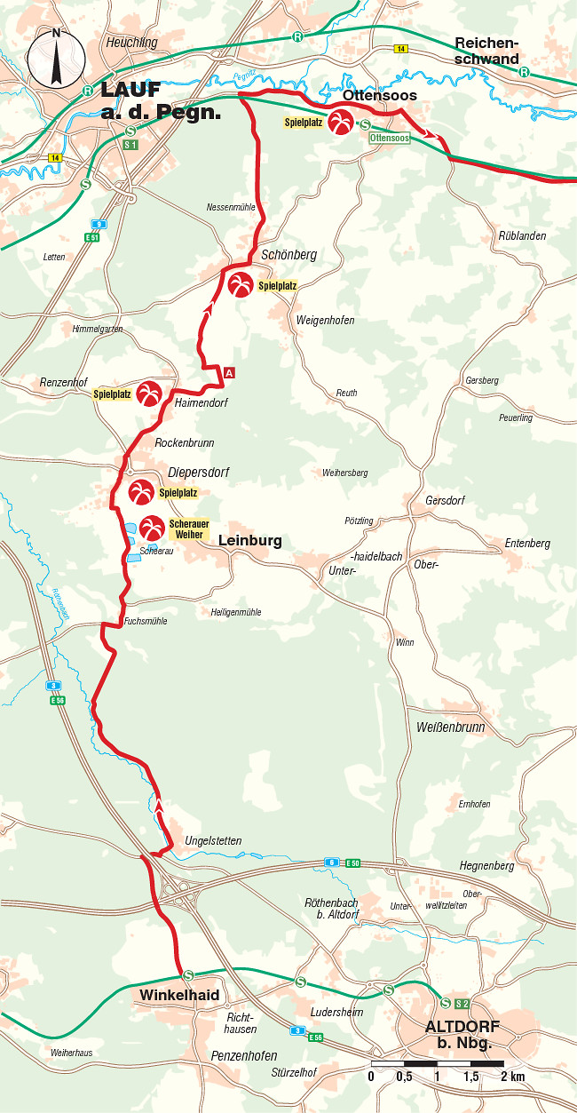 Wer noch Kraft hat oder an einem anderen Tag diese Tour fortsetzen möchte, dem sei diese Route empfohlen. Sie verläuft ohne größere Höhenunterschiede immer in Flusstälern von West nach Ost. Bis vor Pommelsbrunn folgen wir dabei dem Lauf der Pegnitz, danach dem hier in die Pegnitz mündenden Högenbach bis zur S-Bahn-Endhaltestelle der S1 nach Hartmannshof.