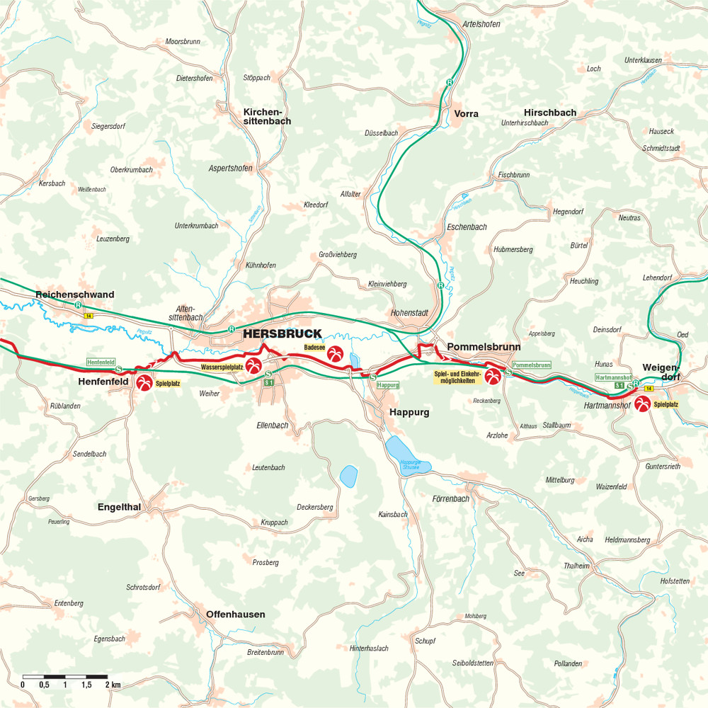 An der Strecke sind zahlreiche attraktive Rastplätze und Einkehrmöglichkeiten zu finden. Einige Beispiele: Hersbruck mit seinen vielen Sehenswürdigkeiten ist eigentlich einen eigenen Tagesausflug wert. Wer in die Innenstadt zu einer Besichtigung abbiegen möchte, überquert die Pegnitz auf dem schmalen Fußgängersteg, auf den unser Radweg stößt. Danach die Richtung (nach Norden) beibehalten und auf Beschilderungen in Richtung Stadtzentrum achten. Weitere Rast- und Einkehrmöglichkeiten bis Hartmannshof im Überblick: Der bald darauf an der Strecke folgende Happurger Badesee ist eine attraktive Freizeit- und Badeanlage (mit Kiosk und Einkehrmöglichkeit). Direkt an der S-Bahn-Station Pommelsbrunn befindet sich ein sehr schöner Rastplatz mit Kneippanlage (an der Weidenmühle). Weitere Rast- und Spielplätze sind an der Strecke vorhanden und leicht selbst zu finden. Falls die Kräfte nachlassen, gibt es direkt am Radweg einige S-Bahn-Stationen S1, die eine Abkürzung der Tour ermöglichen.