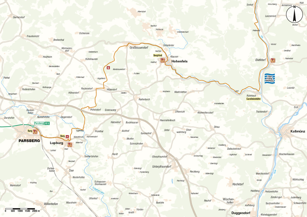 Vor Rohrbach dann ein Stück Industriegeschichte: Wie ein Fossil liegt die immer noch in Betrieb befindliche Eisengießerei Carolinenhütte im idyllischen Forellenbachtal – letzter Hinweis auf die früher zahlreichen erzverarbeitenden Betriebe (siehe „Lohnenswert am Weg“). Kurz danach erreichen wir Rohrbach. Hier mündet der Forellenbach in die Vils. An der gut markierten Einmündung unseres Radwegs halten wir uns nach links und folgen unserer neuen Beschilderung nach Schmidmühlen (ab hier: „Fünf-Flüsse-Radweg“).