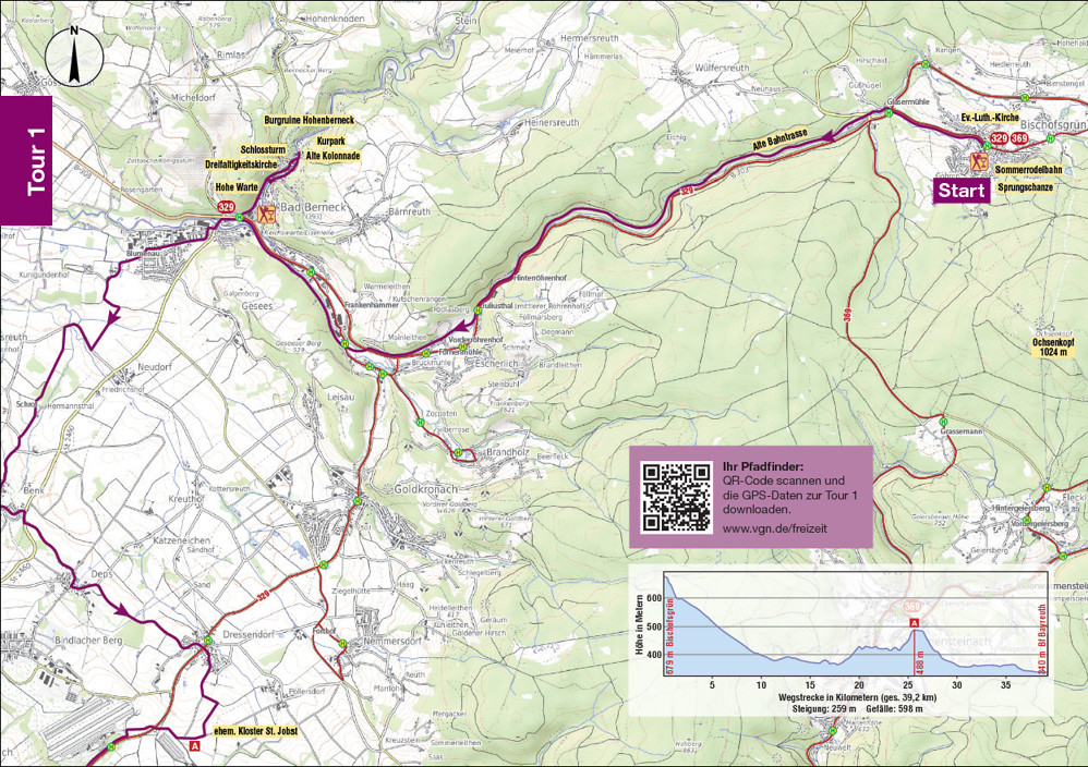 Bischofsgrün, Radbushaltestelle Rathaus (680 hm) 329 369 – Bad Berneck, Radbushaltestelle Busbahnhof (11,9 km; 385 hm) 329 – Bad Berneck, Hotel Bube (12,6 km; 388 hm)