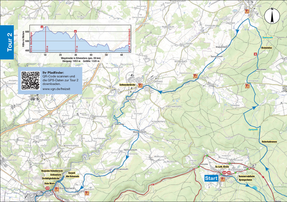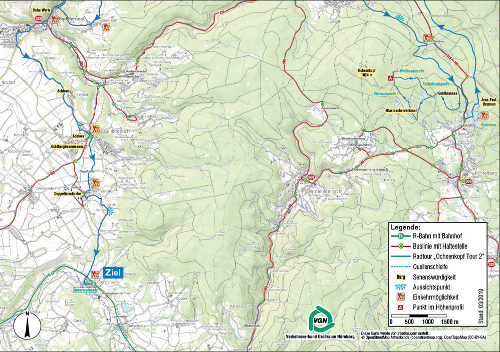 Bei dieser Tour geht es zwar insgesamt über 1.000 Höhenmeter hinauf, aber auch über 1.300 wieder hinunter, was doch deutlich mehr bergab ist – allerdings, und das macht sie dann doch nicht ganz einfach: oft und immer wieder geht’s aufwärts, zuweilen auch steil. Aber wer sagt denn, dass man diese wunderbare Quellen- und Brunnentour in einem Stück fahren muss? So viele schöne Plätze unterwegs zum Pause machen und mehrere Möglichkeiten, die Tour aufzuteilen: die erste Etappe bis Bad Berneck oder Goldkronach, ein andermal von da bis Untersteinach und gleich weiter bis Bayreuth – das wäre ein Vorschlag. Mit dem VGN geht das prima: Entspannt am Ende der Tour in den Bus oder Zug setzen, und niemand muss das abgestellte Auto rückholen!