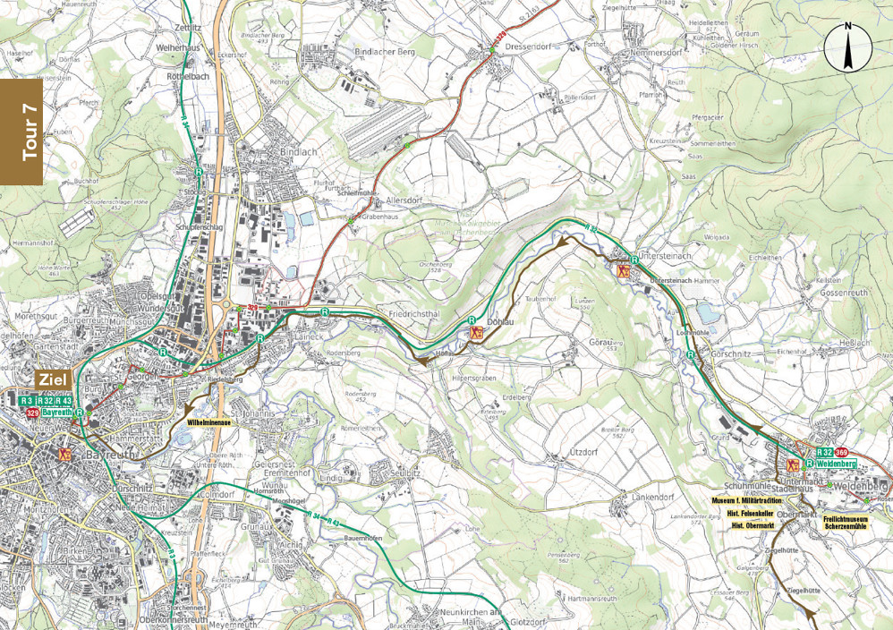 Schmale abwechslungsreiche Sträßchen bringen Sie durch kleine Dörfer, durch den Wald und übers freie Land nach Weidenberg, einem Highlight, das sogar schon mehrmals als Filmkulisse diente. Recht flach ist es dann nur noch bis Untersteinach, wo auch die Touren 2 , 4 und 5 Anschluss nach Bayreuth finden. Mit viel Auf und Ab geht’s nun im engen Tal des Roten Maines so richtig dynamisch zur Sache, bevor es ab Friedrichsthal wieder fast eben wird und wir hinter Laineck in das nun weite Tal des Roten Maines einfahren. Die Touren finden mit der „Wilhelminenaue“, dem großzügig angelegten Landesgartenschaugelände von 2016, einen besonders schönen Abschluss.