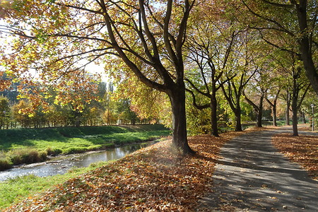 Immer geradeaus dem Hauptweg folgen, an einem Wehr – gebaut als Hochwasserschutz – vorbei. Nach Parkende sind zweimal Autostraßen mit einer Druckknopfampel zu queren, danach immer geradeaus (