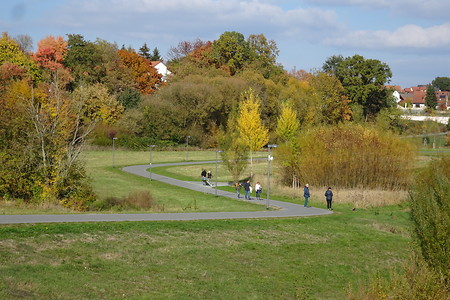Bayreuth Stadtmitte). Es geht unter der Autobahn hindurch, wir kommen zur Hölzleinsmühle, hier nach links in die Eremitagestraße, kurz auf der linken Seite bleiben, dann geht’s mit der Querungshilfe hinüber auf die rechte Seite und nach 140 m (vor der Brücke über den Roten Main) rechts in die Wilhelminenaue, dem ehemaligen Landesgartenschaugelände „Wilhelminenaue“ von 2016 mit zahlreichen Infotafeln und schönen Plätzen.